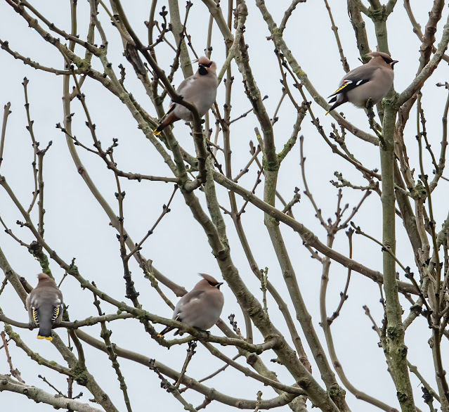 It's been a Waxwing Winter this year but I haven't been really motivated to go and see them because there have been so many photos from other people. However, breakfast out in North Wales with my wife beckoned so it would have been rude not to look. Unfortunately the weather was grey and dismal with plenty of rain and so we only got a few distant glimpses of the large flock that has been flying around the Halkyn mountain area.